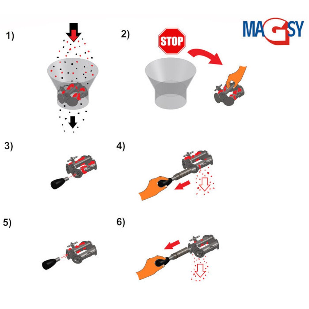 Pri čistení magnetu do násypky buďte veľmi opatrní, magnetické jadrá sú veľmi silné a ich pripevnenie na kovové predmety môže spôsobiť zranenia pricvaknutím, priškripnutím… Neumiestňujte ho na nič magnetické (stoly, ponky, schodnice, podlahy...).