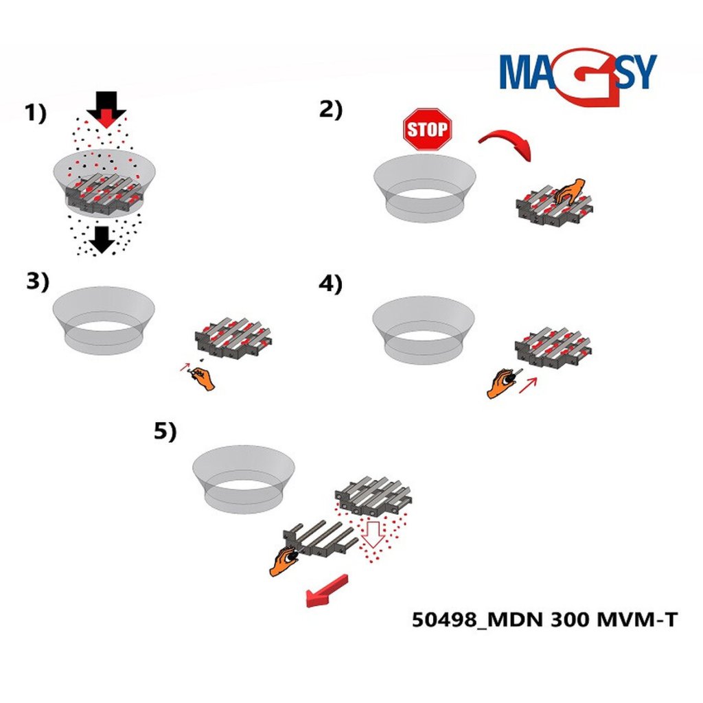 Tento magnet zachytáva (oddeľuje) kovové feromagnetické častice od veľkosti 1 µm a menšie (charakteristický feromagnetický, nemerateľný, magnetický prach) až do veľkosti 3 mm (3x3x3 mm), čo je maximálna frakcia (veľkosť) materiálu, ktorý môže dopadať na magnet do násypky a ktorý sa môže presypávať. Vo výnimočných prípadoch môže tento magnet zachytiť v násypke aj väčšie kovové predmety do veľkosti 5 mm (5x5x5 mm). Predpokládá sa ale náhodný výskyt týchto nečistôt max. do 1% z celkovej hodinovej kapacity presýpaného materiálu (predpokladá sa pravidelné čistenie magnetického roštu od feromagnetických nečistôt, týmto nie je myslené, že celé 1% väčších, feromagnetických nečistôt môže zostať na magnete do násypky po celú dobu sypania hodinovej kapacity sypaného materiálu). Obsah týchto väčších feromagnetických nečistôt nesmie byť vyšší. Ak je prítomnosť týchto väčších feromagnetických nečistôt vo vašom materiáli vyššia, nepoužívajte tento magnet do násypky a obráťte sa na naše obchodné a technické oddelenie, ktoré vám poskytne odborné poradenstvo.