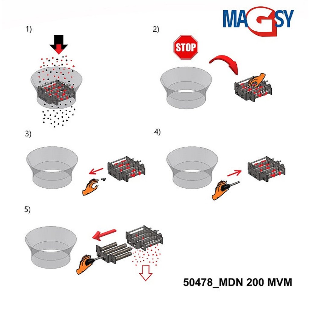Magnet do násypky je navrhnutý tak, aby zachytil čo najviac feromagnetických kovových nečistôt. Všetko však závisí od množstva týchto feromagnetických nečistôt prítomných vo vašom materiáli. Nie je možné zaručiť zachytenie všetkých feromagnetických nečistôt. Vždy je potrebné zohľadniť konkrétnu technológiu a kapacity. V prípade potreby by sa mali do zásobníka vopred zaradiť alebo pridať iné typy magnetickej separácie/magnetických roštov/magnetov. Nespoliehajte sa, prosím, výlučne na tento jeden magnet do násypky. Ak si nie ste istí, nepoužívajte tento typ magnetu do násypky a kedykoľvek kontaktujte našich odborníkov na magnetickú separáciu.