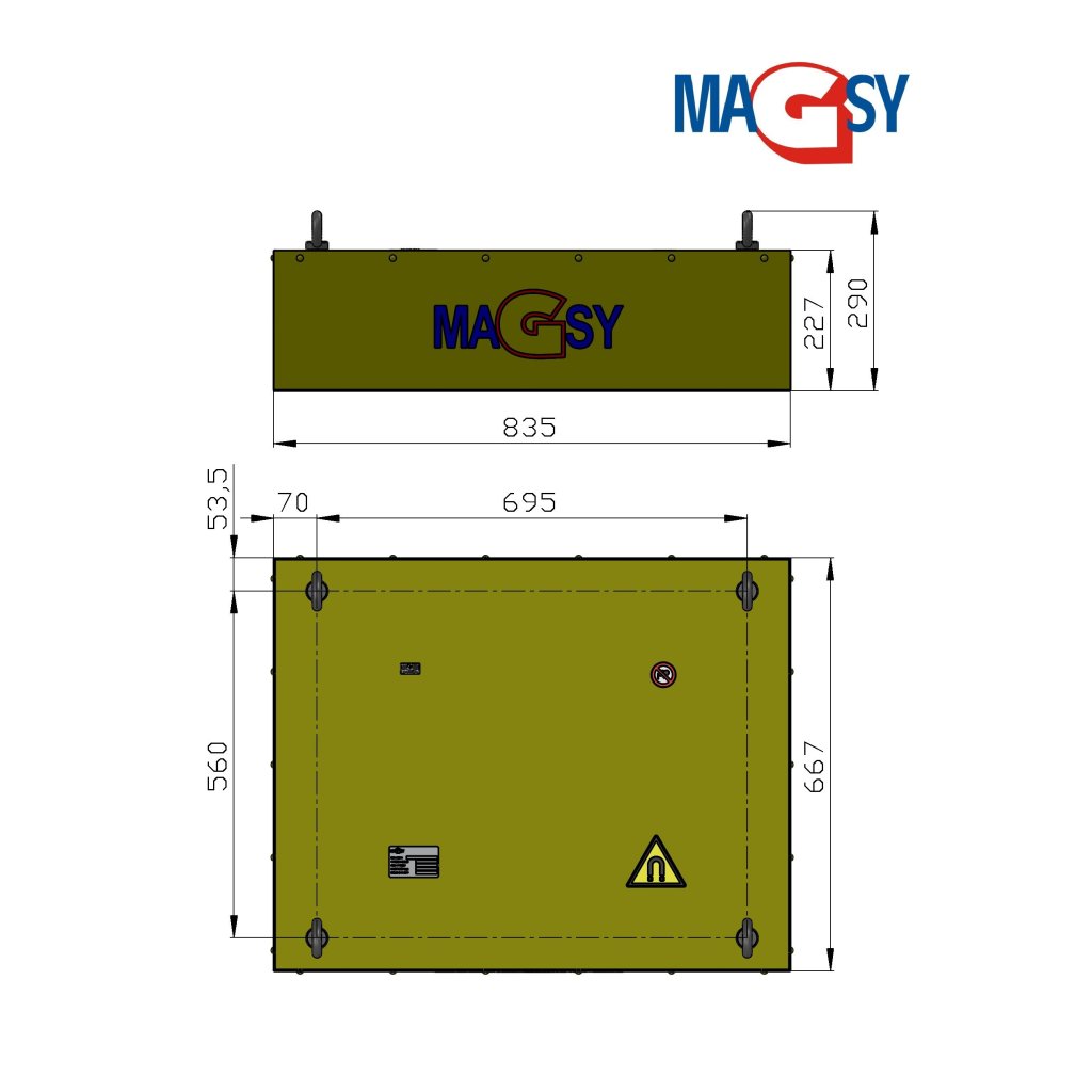 Magnetický separátor nad dopravným pásom (magnetická doska) je vhodný na oddelenie väčších feromagnetických nečistôt od ľahko priepustných materiálov počas ich prepravy na dopravnom páse. Maximálna rýchlosť dopravného pásu prepravujúceho materiál môže byť 1,5 metra za sekundu. Ide o magnetickú dosku, ktorá zachytáva feromagnetický kov a feromagnetický kov sa na nej zachytáva a udržiava magnetickou silou. Magnetické kovy sa potom ručne odstránia. Inštalácia magnetickej dosky je možná len podľa obrázkovej galérie (bez výslovného súhlasu výrobcu neinštalujte magnetickú dosku iným spôsobom, ako je zobrazený na obrázkoch). V prípade, že obrázky, ktoré zobrazujú príklady inštalácie magnetickej dosky, nie sú pre vás jasné a sú pre vás nezrozumiteľné, pred zakúpením magnetickej dosky sa informujte u výrobcu. Magnetická doska (magnetický oddeľovač) sa dodáva bez konštrukcie na jej zavesenie/inštaláciu. Je vybavená 4 závesnými okami na zavesenie magnetickej dosky. Konštrukcia na zavesenie magnetickej dosky (nie je súčasťou dodávky) musí byť dostatočne pevná a silná, aby sa zabránilo nežiaducemu vychýleniu a prenosu akýchkoľvek vibrácií na magnetickú dosku. Odporúčame používať výškovo nastaviteľné závesy z dôvodu možnosti nastavenia výšky zavesenia magnetickej dosky a tým priblíženia sa k prepravovanému materiálu pre vyššiu účinnosť.