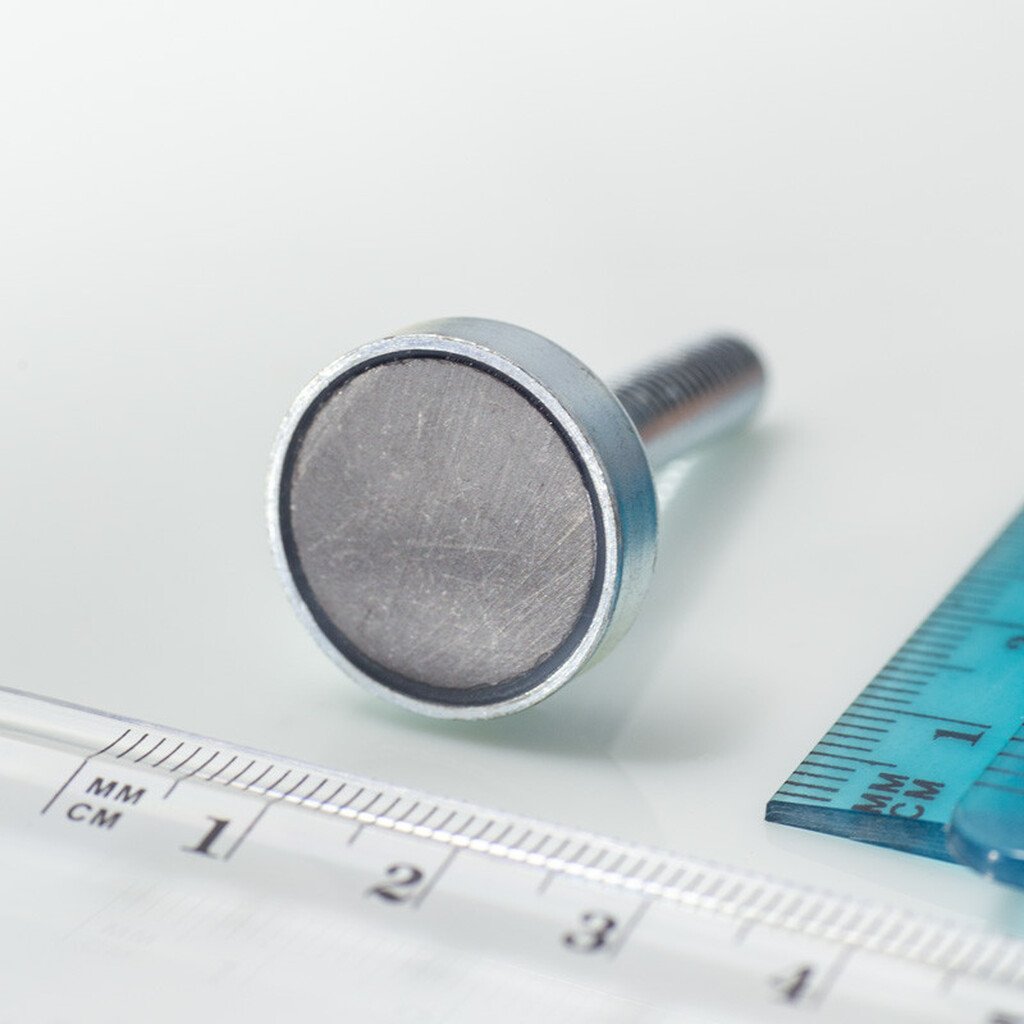 Magnetická šošovka so stopkou pr. 20 x výška 6 mm s vonkajším závitom M6, dlžka závitu 30 mm
