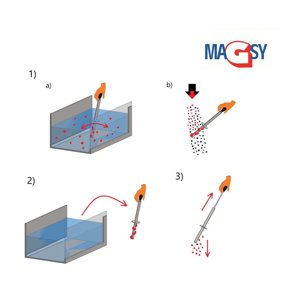 Magnetická testovací tyč o průměru 26 mm slouží ke kontrole a testování přítomnosti kovových a magnetických nečistot na vybraném materiále. Lze použít do suchých směsí i tekutých látek. Uvnitř se nachází magnetické jádro se silnými NdFeB magnety s dostatečným výkonem pro testování magnetických nečistot. Pomocí krouživých pohyb lze otestovat, zda materiál obsahuje magnetické nečistoty. Ty se zachytávají na funkční polovině tyče. Pro jejich následné odstranění stačí zatáhnout za madlo a nečistoty automaticky odpadnou z povrchu tyče. Nemusíte nic zdlouhavě ručně čistit.