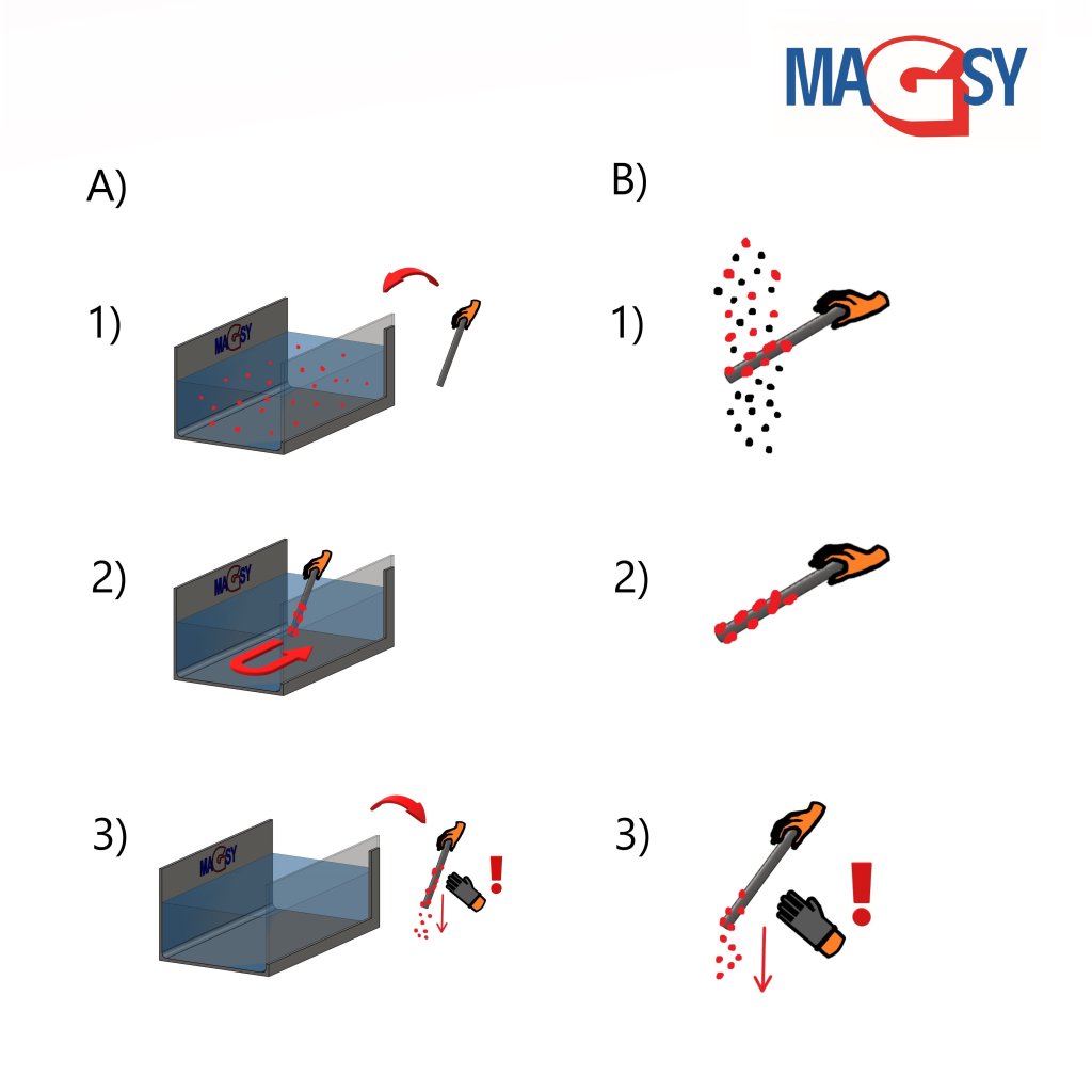 Magnetickú tyč môžete použiť aj samostatne, a to tak, že ju priamo, voľne vložíte do materiálu, a to v suchom aj tekutom materiáli. Je odolná voči vlhkosti, takže ju možno ponoriť (čiastočne alebo úplne) do kvapalín. Magnetickú tyčinku nevkladajte a nepoužívajte v agresívnych látkach a kyselinách. Hodnota pH kvapaliny, v ktorej je tyčinka umiestnená (v ktorej budete magnetickú tyčinku používať), musí byť minimálne 6,5 a maximálne 8,5. Ak má kvapalina iné pH, magnetickú tyč nepoužívajte. Prosím, kontaktujte naše technické oddelenie predaja, ktoré vám poskytne viac informácií, potvrdí vhodnosť magnetickej tyče alebo odporučí použitie iného výrobku z nášho sortimentu.